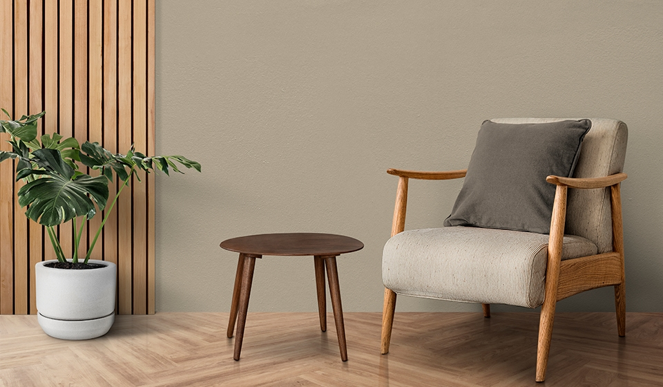 A poltrona cria o ponto de destaque, enquanto mesa e vaso complementam dando profundidade