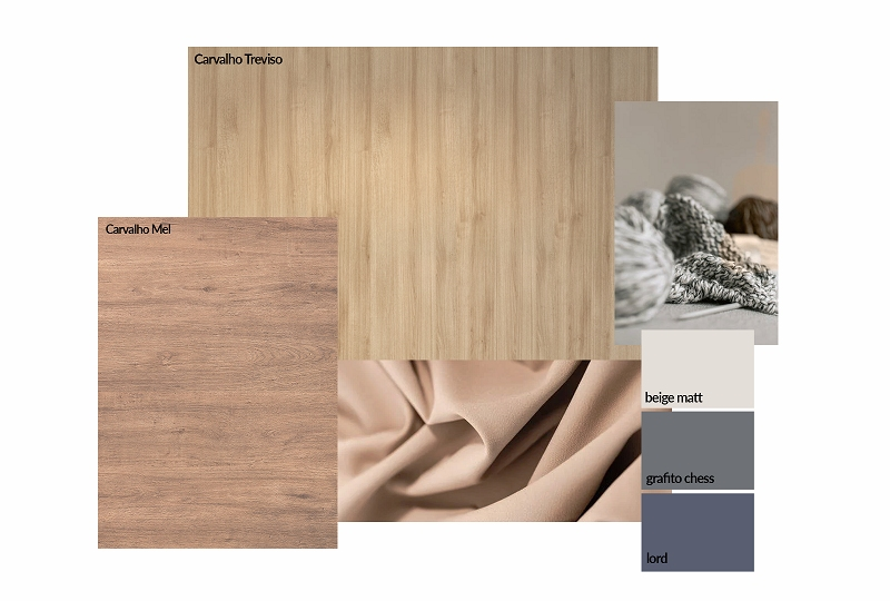 Nos projetos de mobiliário planejado da Adesso, o conforto e leveza podem ser obtidos em combinações com os padrões Carvalho Mel e Carvalho Treviso. Madeirados clássicos, que por suas tonalidades neutras, criam ambientes que harmonizam perfeitamente com paletas em tons claros, como o Beige Matt, ou ainda criando contraste com nuances mais escuros como o Grafito Chess e o Lord.