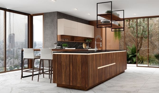 Para quem busca uma combinação mais ousada, a composição de madeirados escuros com cores mais sóbrias como o bege e o cinza, torna os espaços intimistas e elegantes. E para trazer vida ao ambiente é essencial aproxima-lo da natureza. A aplicação de acabamentos como a pedra, o uso de plantas e uma boa iluminação natural são elementos que trazem essa proximidade e equilibram o espaço.
