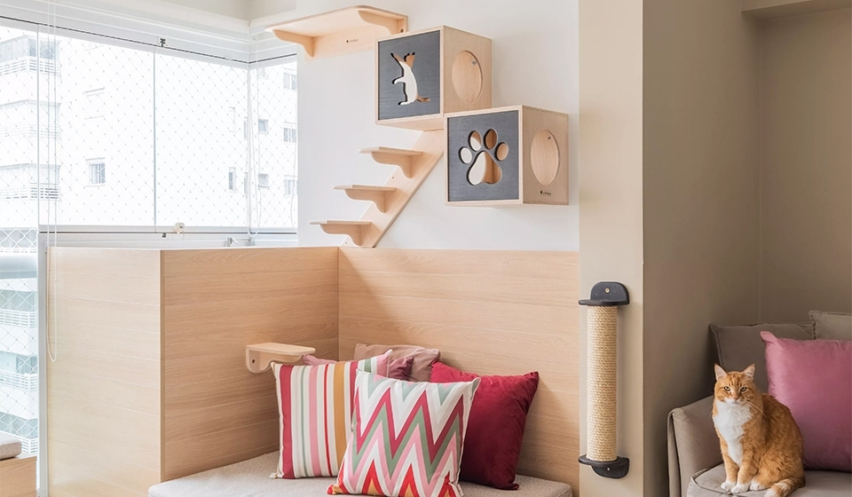 Para gatos, existem prateleiras e nichos fabricados especialmente para criar um playground para os bichanos. Esses espaços de brincadeiras são ótimos para entreter os gatos, já que são opções interessantes para eles se sentirem seguros para descansar, saltar, brincar e exercitar suas habilidades e instintos.
